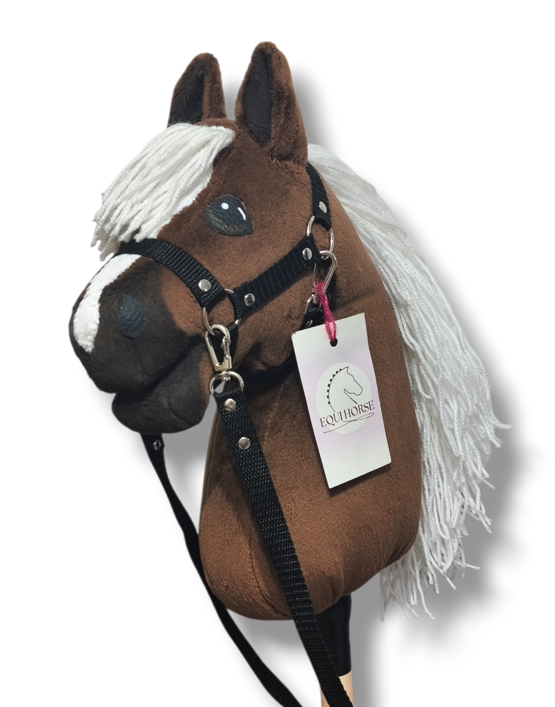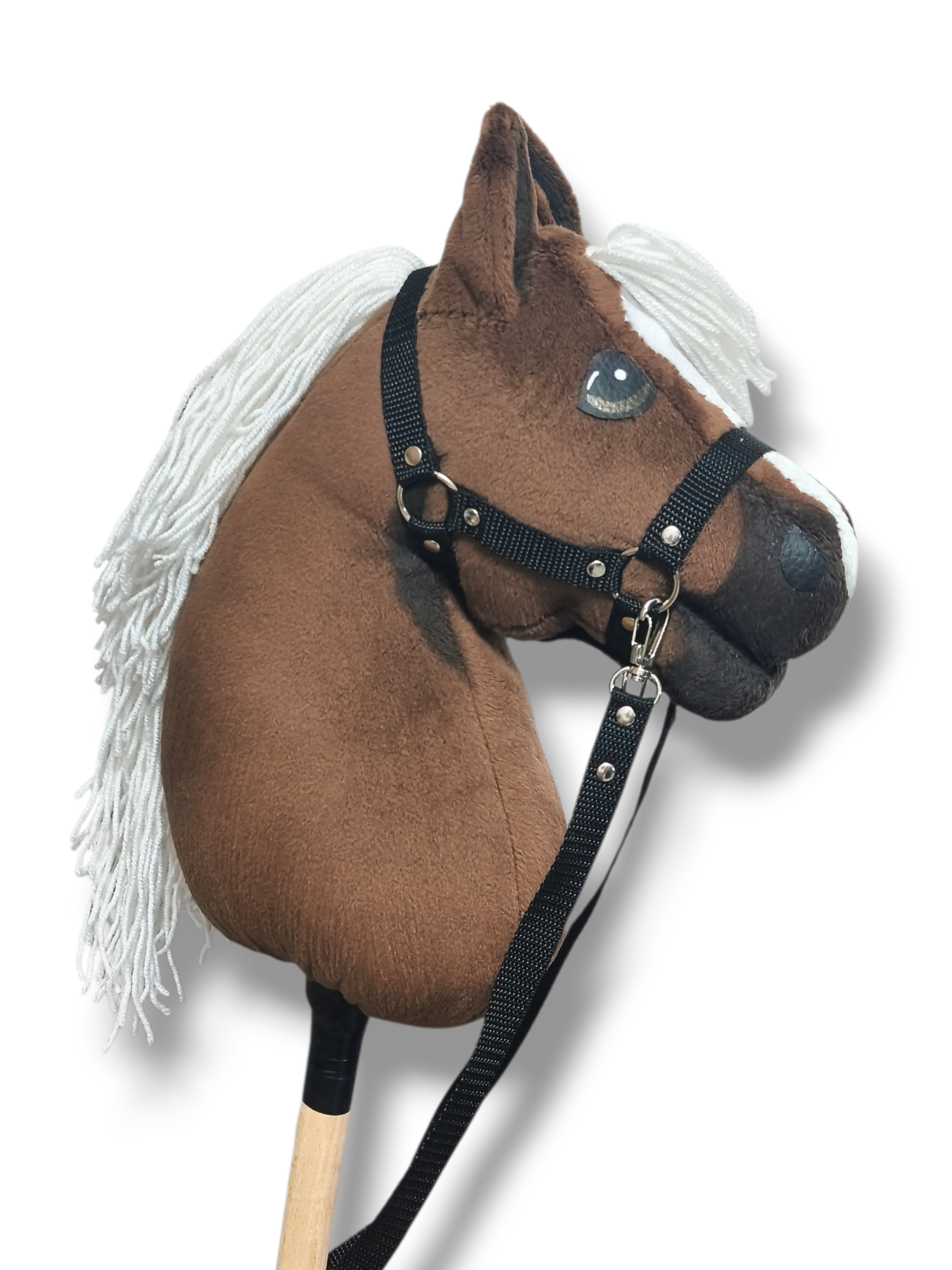 Konik w komplecie z kantarem i wodzami w kolorze czarnym. (Istnieje możliwość zmiany koloru kantarka i wodzy na: biały, czerwony, błękitny, fioletowy, jasny róż, ciemny róż, chabrowy, zieleń butelkowa, granatowy – w takim przypadku prosimy o wiadomość).