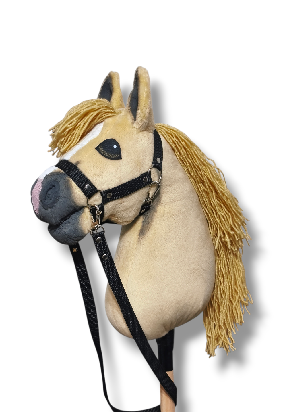 Konik w komplecie z kantarem i wodzami w kolorze czarnym. (Istnieje możliwość zmiany koloru kantarka i wodzy na: biały, czerwony, błękitny, fioletowy, jasny róż, ciemny róż, chabrowy, zieleń butelkowa, granatowy – w takim przypadku prosimy o wiadomość).
