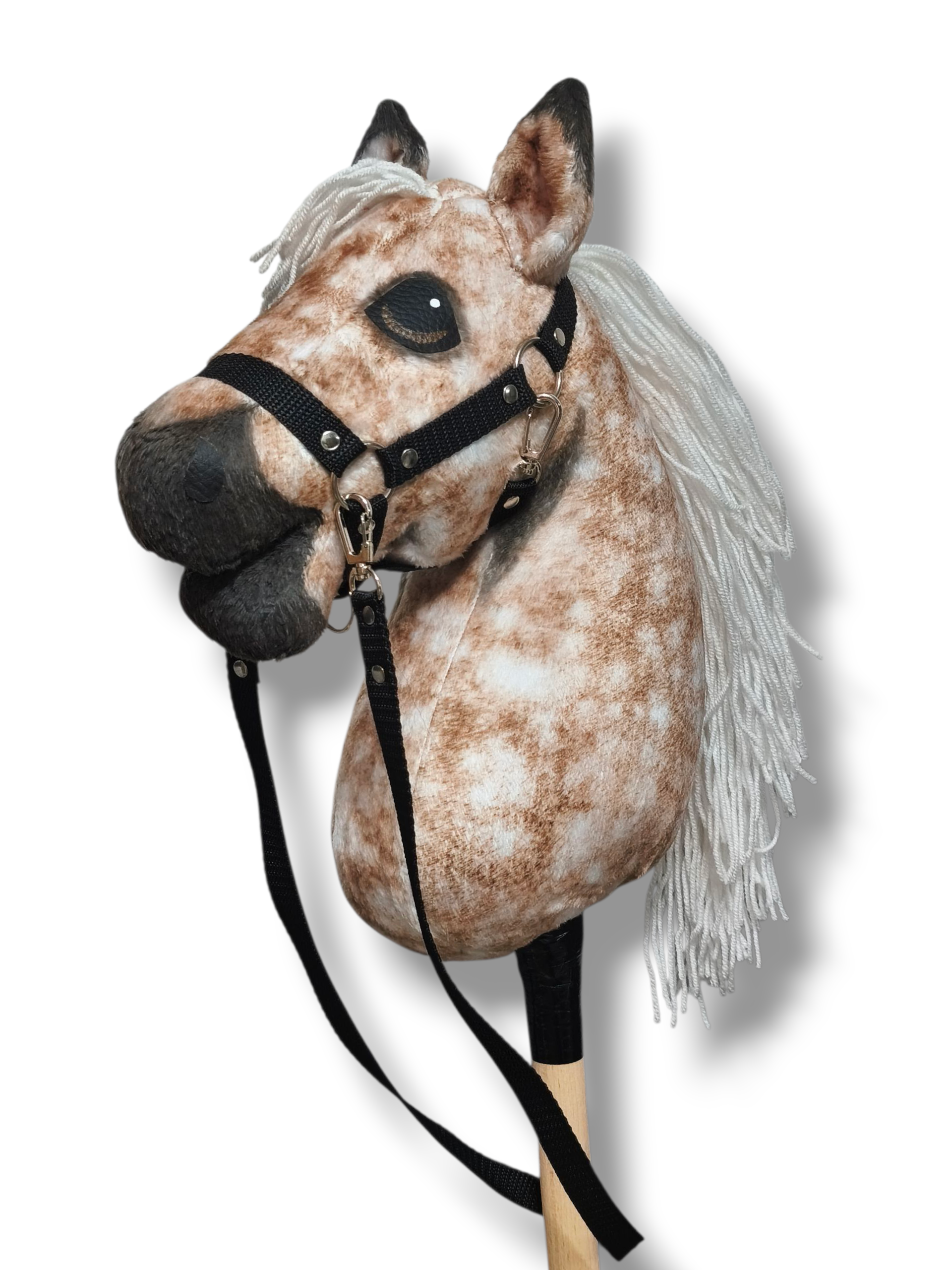 Konik w komplecie z kantarem i wodzami w kolorze czarnym. (Istnieje możliwość zmiany koloru kantarka i wodzy na: biały, czerwony, błękitny, fioletowy, jasny róż, ciemny róż, chabrowy, zieleń butelkowa, granatowy – w takim przypadku prosimy o wiadomość).